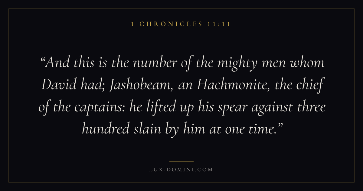 And this is the number of the mighty men whom David had; Jashobeam, an Hachmonite, the chief of the captains: he lifted up his spear against three hundred slain by him at one time.