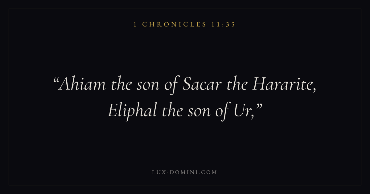 Books / 1 Chronicles / Chapter 11 / Verse 35 ← 1 Chronicles 11:34 1 Chronicles 11:35 1 Chronicles 11:36 → Ahiam the son of Sacar the Hararite, Eliphal the son of Ur, Download verse card Share on Twitter Share on Facebook Pin it ✦ Key themes MemoryWorshipGenealogyDavid Read with 1 Chronicles 11:311 Chronicles 11:32 Related topics Bible verses about worship ✦ 1 Chronicles Chapter 11 verses V. 1 V. 2 V. 3 V. 4 V. 5 V. 6 V. 7 V. 8 V. 9 V. 10 V. 11 V. 12 V. 13 V. 14 V. 15 V. 16 V. 17 V. 18 V. 19 V. 20 V. 21 V. 22 V. 23 V. 24 V. 25 V. 26 V. 27 V. 28 V. 29 V. 30 V. 31 V. 32 V. 33 V. 34 V. 35 V. 36 V. 37 V. 38 V. 39 V. 40 V. 41 V. 42 V. 43 V. 44 V. 45 V. 46 V. 47