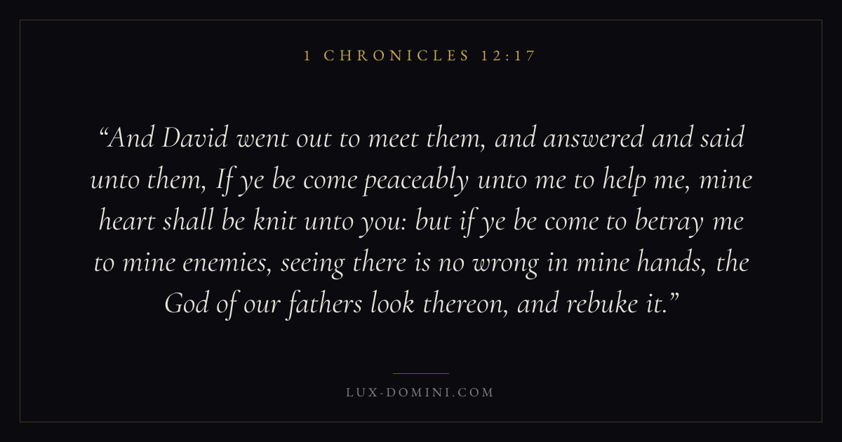 And David went out to meet them, and answered and said unto them, If ye be come peaceably unto me to help me, mine heart shall be knit unto you: but if ye be come to betray me to mine enemies, seeing there is no wrong in mine hands, the God of our fathers look thereon, and rebuke it.