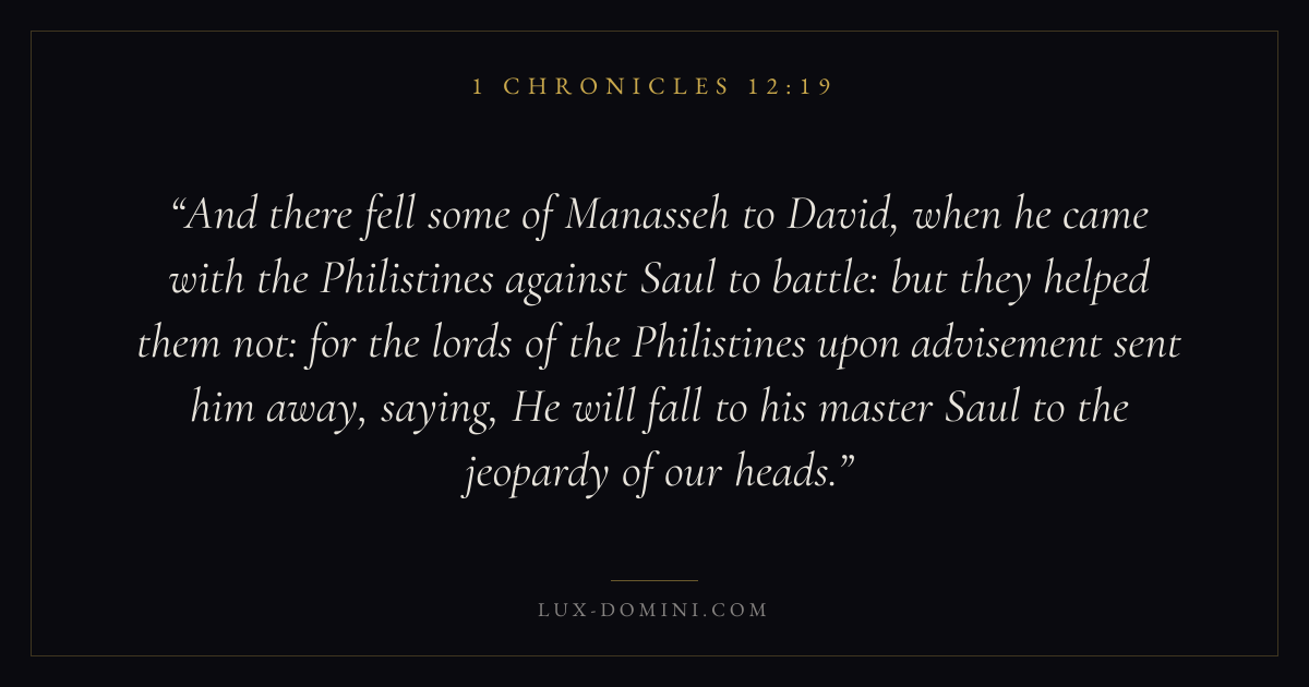 And there fell some of Manasseh to David, when he came with the Philistines against Saul to battle: but they helped them not: for the lords of the Philistines upon advisement sent him away, saying, He will fall to his master Saul to the jeopardy of our heads.