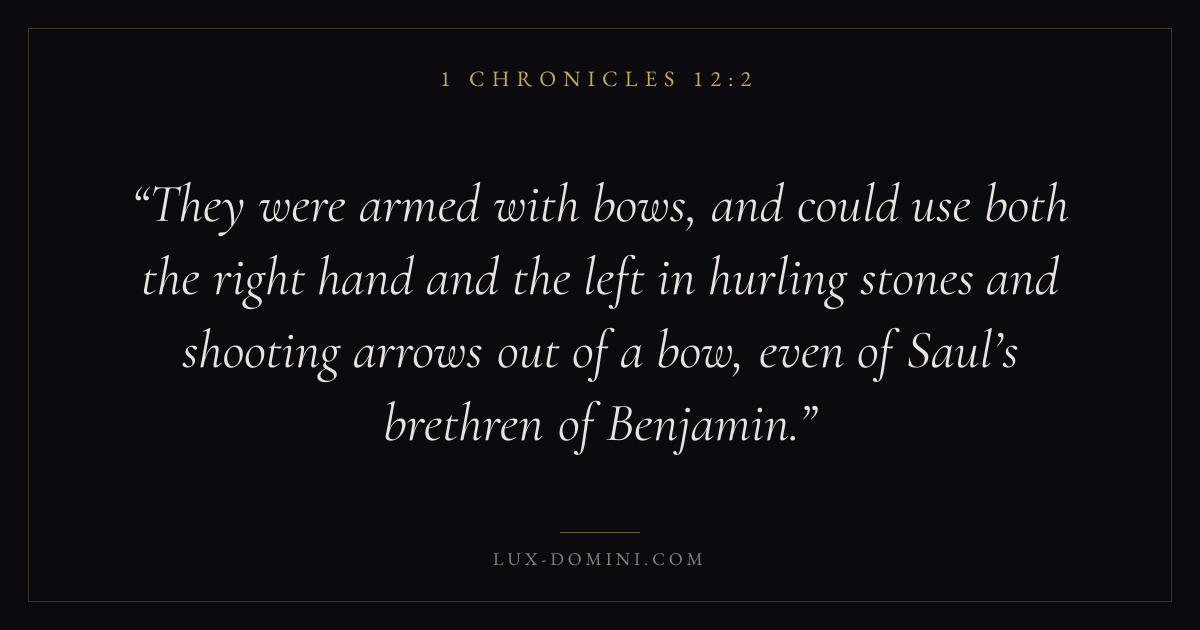 They were armed with bows, and could use both the right hand and the left in hurling stones and shooting arrows out of a bow, even of Saul’s brethren of Benjamin.