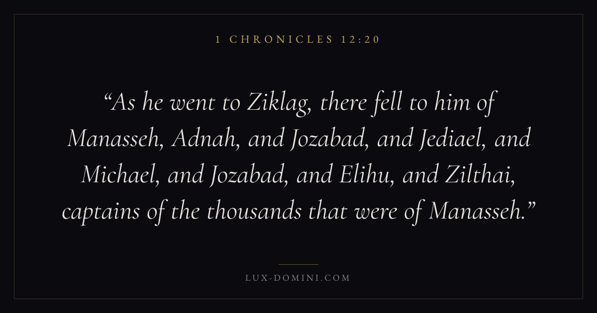 As he went to Ziklag, there fell to him of Manasseh, Adnah, and Jozabad, and Jediael, and Michael, and Jozabad, and Elihu, and Zilthai, captains of the thousands that were of Manasseh.