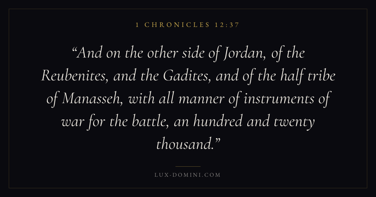 And on the other side of Jordan, of the Reubenites, and the Gadites, and of the half tribe of Manasseh, with all manner of instruments of war for the battle, an hundred and twenty thousand.