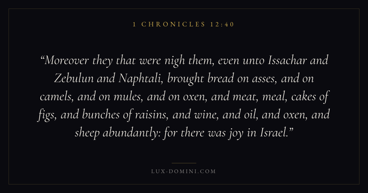 Moreover they that were nigh them, even unto Issachar and Zebulun and Naphtali, brought bread on asses, and on camels, and on mules, and on oxen, and meat, meal, cakes of figs, and bunches of raisins, and wine, and oil, and oxen, and sheep abundantly: for there was joy in Israel.