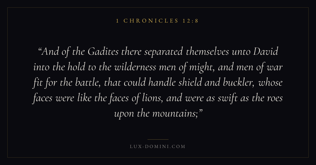 And of the Gadites there separated themselves unto David into the hold to the wilderness men of might, and men of war fit for the battle, that could handle shield and buckler, whose faces were like the faces of lions, and were as swift as the roes upon the mountains;