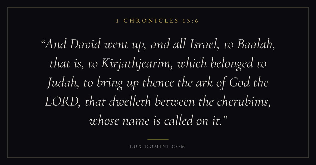 And David went up, and all Israel, to Baalah, that is, to Kirjathjearim, which belonged to Judah, to bring up thence the ark of God the LORD, that dwelleth between the cherubims, whose name is called on it.