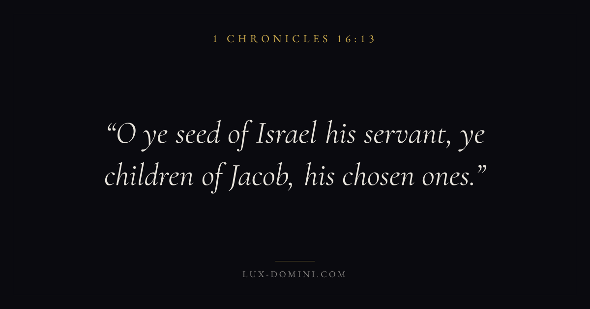 Books / 1 Chronicles / Chapter 16 / Verse 13 ← 1 Chronicles 16:12 1 Chronicles 16:13 1 Chronicles 16:14 → O ye seed of Israel his servant, ye children of Jacob, his chosen ones. Download verse card Share on Twitter Share on Facebook Pin it ✦ Key themes MemoryWorshipGenealogyDavid Read with 1 Chronicles 16:121 Chronicles 16:14 Related topics Bible verses about worship ✦ 1 Chronicles Chapter 16 verses V. 1 V. 2 V. 3 V. 4 V. 5 V. 6 V. 7 V. 8 V. 9 V. 10 V. 11 V. 12 V. 13 V. 14 V. 15 V. 16 V. 17 V. 18 V. 19 V. 20 V. 21 V. 22 V. 23 V. 24 V. 25 V. 26 V. 27 V. 28 V. 29 V. 30 V. 31 V. 32 V. 33 V. 34 V. 35 V. 36 V. 37 V. 38 V. 39 V. 40 V. 41 V. 42 V. 43