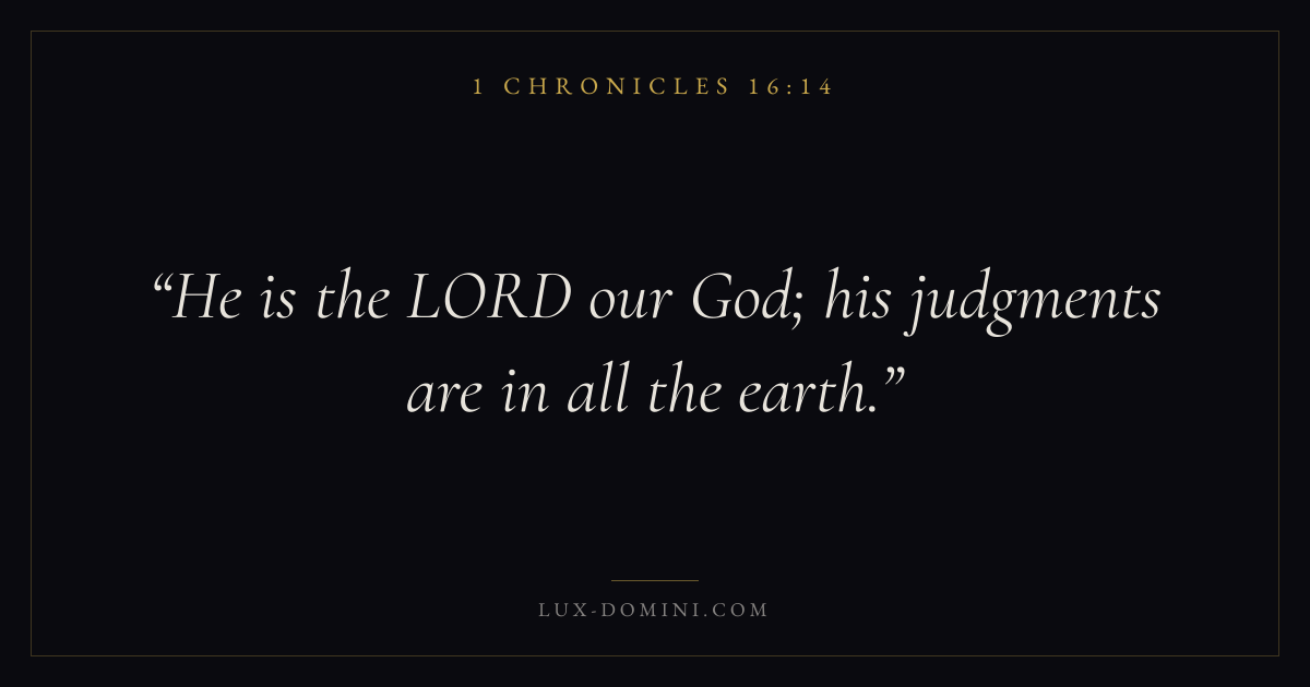 Books / 1 Chronicles / Chapter 16 / Verse 14 ← 1 Chronicles 16:13 1 Chronicles 16:14 1 Chronicles 16:15 → He is the LORD our God; his judgments are in all the earth. Download verse card Share on Twitter Share on Facebook Pin it ✦ Key themes MemoryWorshipGenealogyDavid Read with 1 Chronicles 16:121 Chronicles 16:13 Related topics Bible verses about worship ✦ 1 Chronicles Chapter 16 verses V. 1 V. 2 V. 3 V. 4 V. 5 V. 6 V. 7 V. 8 V. 9 V. 10 V. 11 V. 12 V. 13 V. 14 V. 15 V. 16 V. 17 V. 18 V. 19 V. 20 V. 21 V. 22 V. 23 V. 24 V. 25 V. 26 V. 27 V. 28 V. 29 V. 30 V. 31 V. 32 V. 33 V. 34 V. 35 V. 36 V. 37 V. 38 V. 39 V. 40 V. 41 V. 42 V. 43
