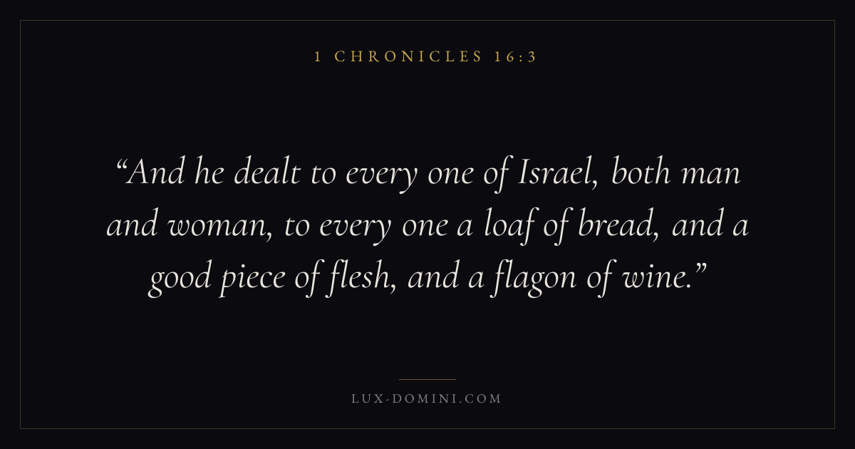 And he dealt to every one of Israel, both man and woman, to every one a loaf of bread, and a good piece of flesh, and a flagon of wine.