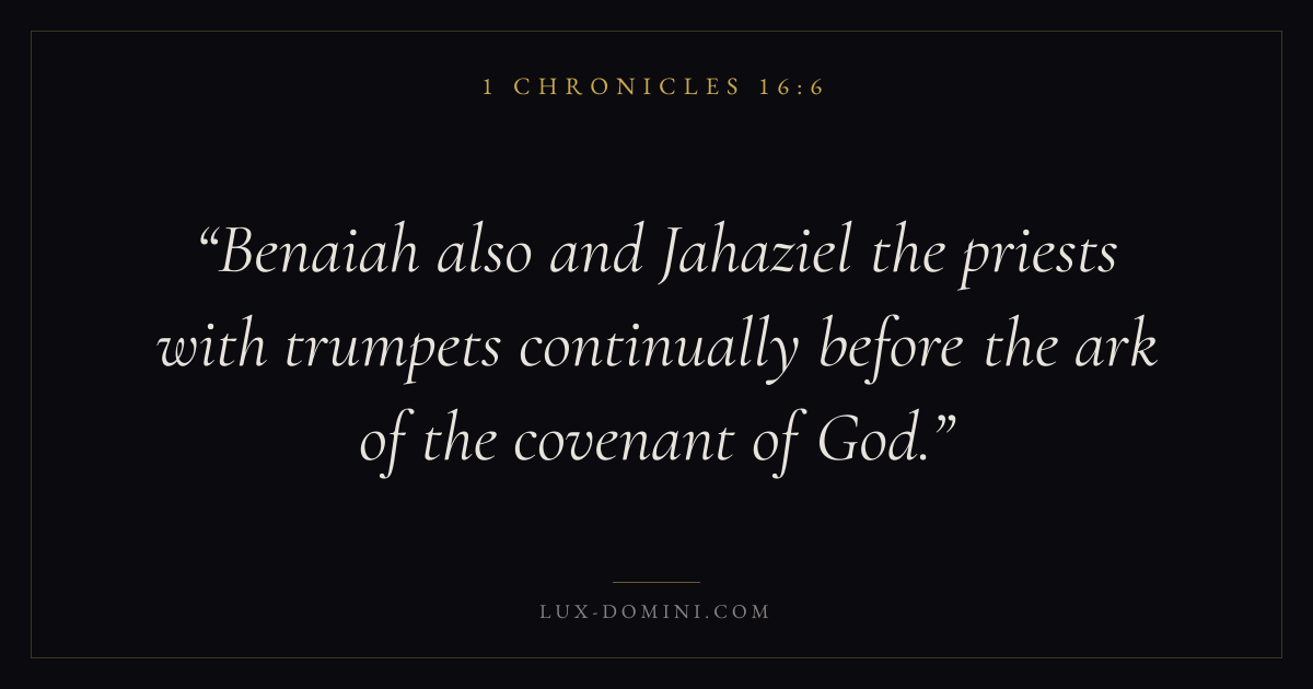 Benaiah also and Jahaziel the priests with trumpets continually before the ark of the covenant of God.