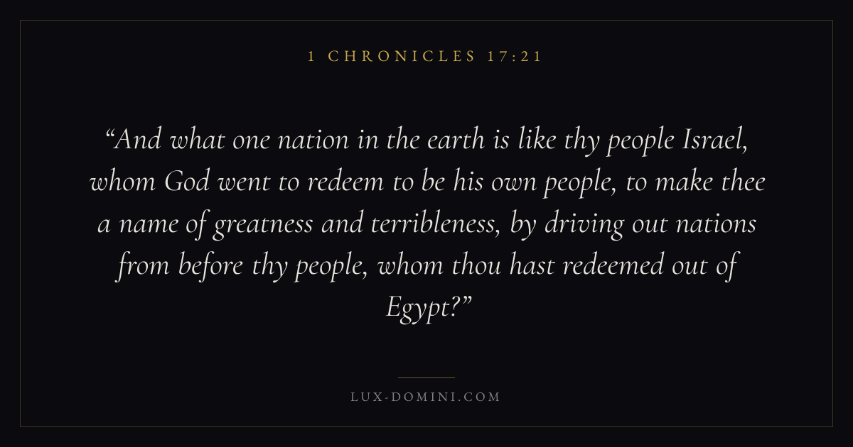 And what one nation in the earth is like thy people Israel, whom God went to redeem to be his own people, to make thee a name of greatness and terribleness, by driving out nations from before thy people, whom thou hast redeemed out of Egypt?