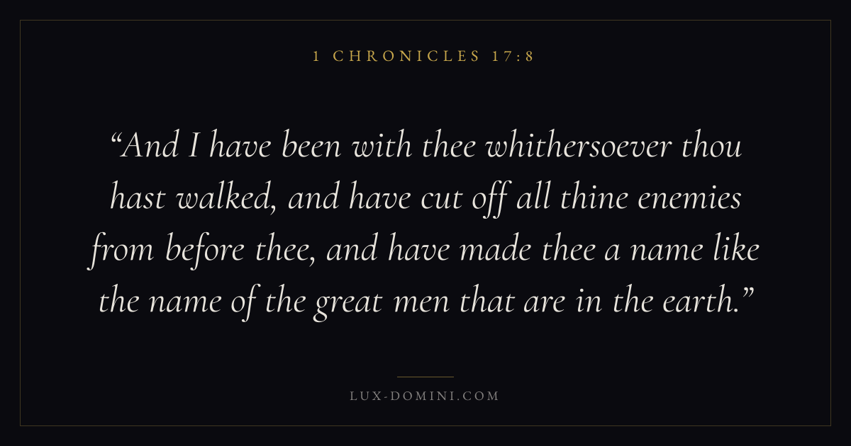 And I have been with thee whithersoever thou hast walked, and have cut off all thine enemies from before thee, and have made thee a name like the name of the great men that are in the earth.