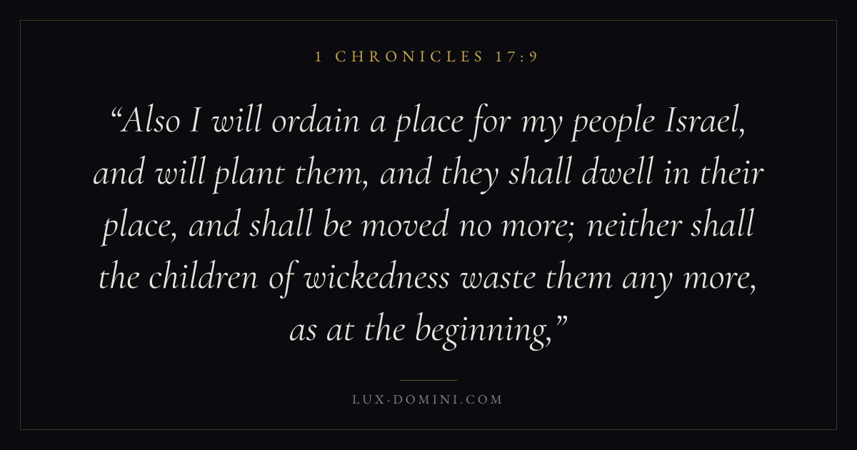 Also I will ordain a place for my people Israel, and will plant them, and they shall dwell in their place, and shall be moved no more; neither shall the children of wickedness waste them any more, as at the beginning,