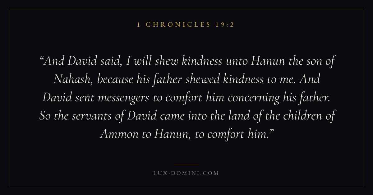 And David said, I will shew kindness unto Hanun the son of Nahash, because his father shewed kindness to me. And David sent messengers to comfort him concerning his father. So the servants of David came into the land of the children of Ammon to Hanun, to comfort him.