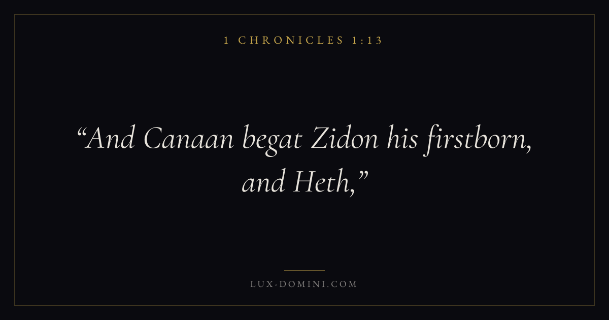 Books / 1 Chronicles / Chapter 1 / Verse 13 ← 1 Chronicles 1:12 1 Chronicles 1:13 1 Chronicles 1:14 → And Canaan begat Zidon his firstborn, and Heth, Download verse card Share on Twitter Share on Facebook Pin it ✦ Key themes SalvationTruthMemoryWorship Read with 1 Chronicles 1:141 Chronicles 1:15John 3:16Ephesians 2:8 Related topics Bible verses about salvationBible verses about truthBible verses about worship ✦ 1 Chronicles Chapter 1 verses V. 1 V. 2 V. 3 V. 4 V. 5 V. 6 V. 7 V. 8 V. 9 V. 10 V. 11 V. 12 V. 13 V. 14 V. 15 V. 16 V. 17 V. 18 V. 19 V. 20 V. 21 V. 22 V. 23 V. 24 V. 25 V. 26 V. 27 V. 28 V. 29 V. 30 V. 31 V. 32 V. 33 V. 34 V. 35 V. 36 V. 37 V. 38 V. 39 V. 40 V. 41 V. 42 V. 43 V. 44 V. 45 V. 46 V. 47 V. 48 V. 49 V. 50 V. 51 V. 52 V. 53 V. 54