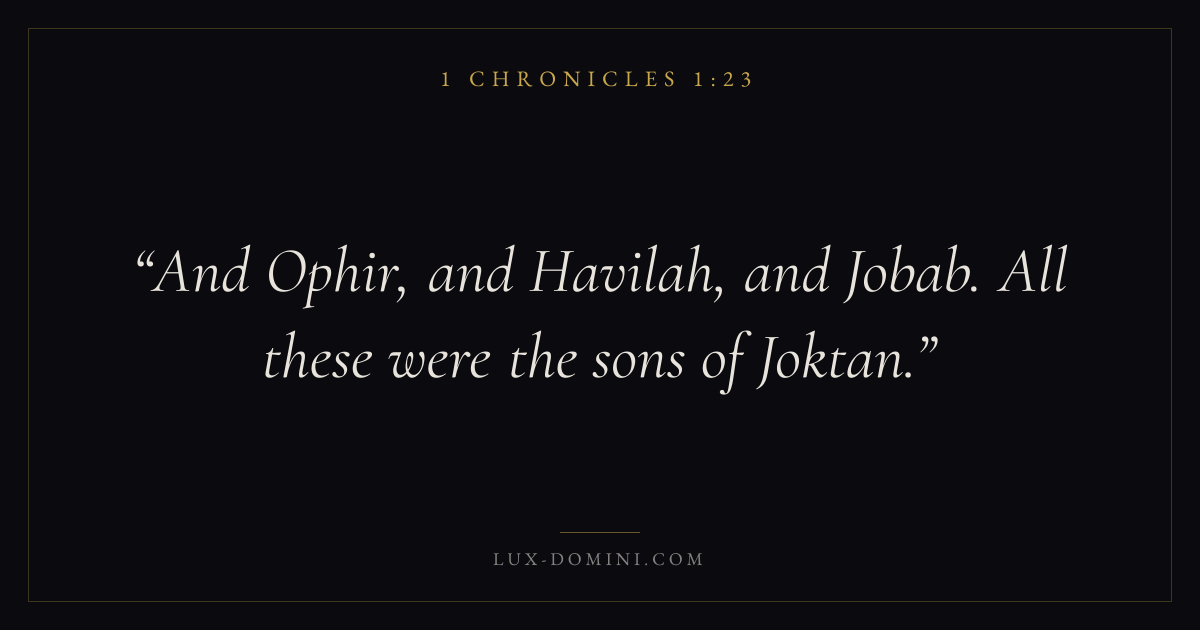 Books / 1 Chronicles / Chapter 1 / Verse 23 ← 1 Chronicles 1:22 1 Chronicles 1:23 1 Chronicles 1:24 → And Ophir, and Havilah, and Jobab. All these were the sons of Joktan. Download verse card Share on Twitter Share on Facebook Pin it ✦ Key themes SalvationTruthMemoryWorship Read with 1 Chronicles 1:22John 3:16Ephesians 2:8John 14:6 Related topics Bible verses about salvationBible verses about truthBible verses about worship ✦ 1 Chronicles Chapter 1 verses V. 1 V. 2 V. 3 V. 4 V. 5 V. 6 V. 7 V. 8 V. 9 V. 10 V. 11 V. 12 V. 13 V. 14 V. 15 V. 16 V. 17 V. 18 V. 19 V. 20 V. 21 V. 22 V. 23 V. 24 V. 25 V. 26 V. 27 V. 28 V. 29 V. 30 V. 31 V. 32 V. 33 V. 34 V. 35 V. 36 V. 37 V. 38 V. 39 V. 40 V. 41 V. 42 V. 43 V. 44 V. 45 V. 46 V. 47 V. 48 V. 49 V. 50 V. 51 V. 52 V. 53 V. 54