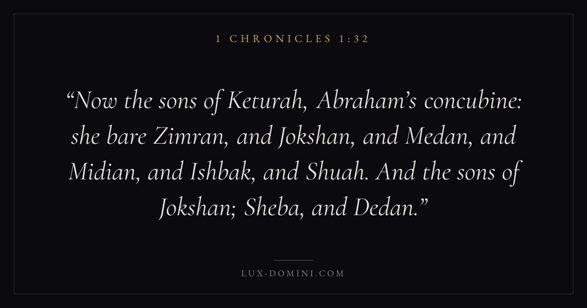 Now the sons of Keturah, Abraham’s concubine: she bare Zimran, and Jokshan, and Medan, and Midian, and Ishbak, and Shuah. And the sons of Jokshan; Sheba, and Dedan.
