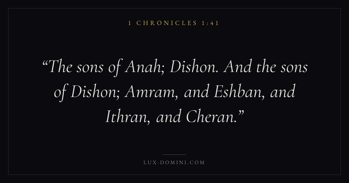 The sons of Anah; Dishon. And the sons of Dishon; Amram, and Eshban, and Ithran, and Cheran.