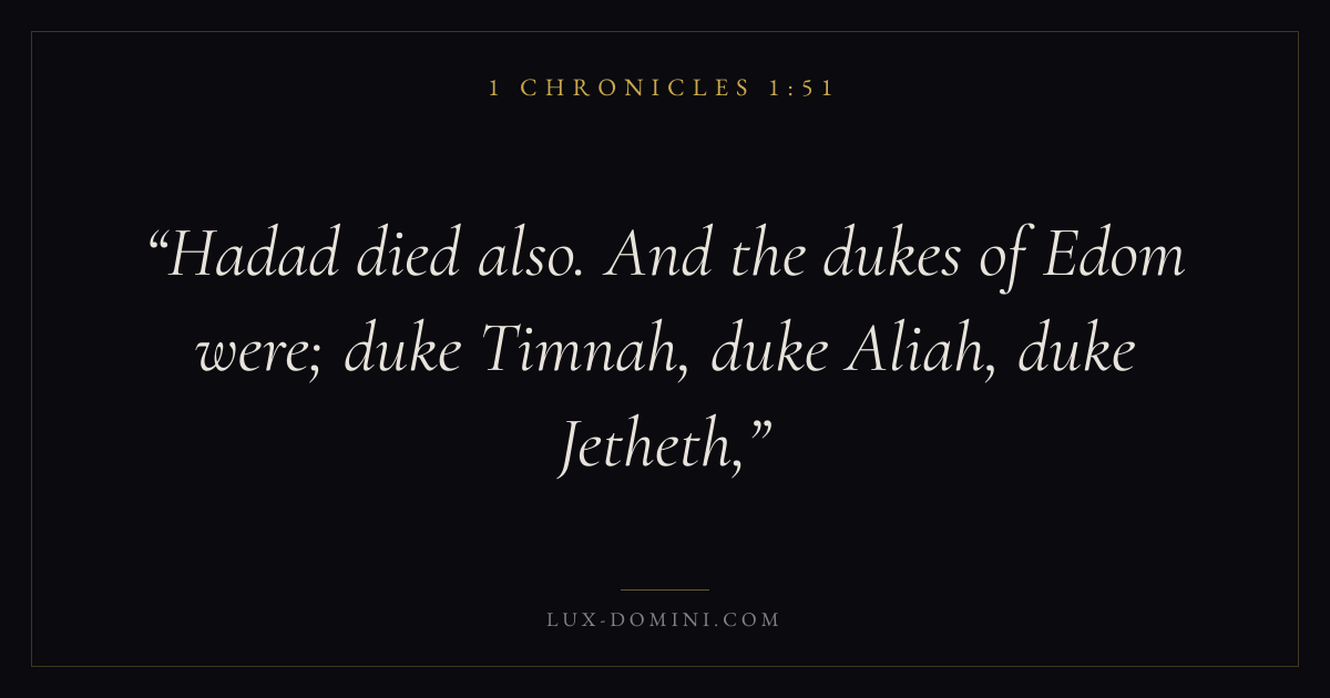 Hadad died also. And the dukes of Edom were; duke Timnah, duke Aliah, duke Jetheth,