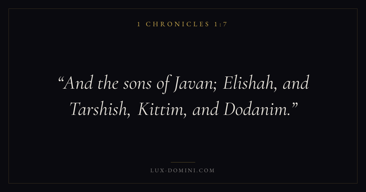 Books / 1 Chronicles / Chapter 1 / Verse 7 ← 1 Chronicles 1:6 1 Chronicles 1:7 1 Chronicles 1:8 → And the sons of Javan; Elishah, and Tarshish, Kittim, and Dodanim. Download verse card Share on Twitter Share on Facebook Pin it ✦ Key themes SalvationTruthMemoryWorship Read with 1 Chronicles 1:51 Chronicles 1:6John 3:16Ephesians 2:8 Related topics Bible verses about salvationBible verses about truthBible verses about worship ✦ 1 Chronicles Chapter 1 verses V. 1 V. 2 V. 3 V. 4 V. 5 V. 6 V. 7 V. 8 V. 9 V. 10 V. 11 V. 12 V. 13 V. 14 V. 15 V. 16 V. 17 V. 18 V. 19 V. 20 V. 21 V. 22 V. 23 V. 24 V. 25 V. 26 V. 27 V. 28 V. 29 V. 30 V. 31 V. 32 V. 33 V. 34 V. 35 V. 36 V. 37 V. 38 V. 39 V. 40 V. 41 V. 42 V. 43 V. 44 V. 45 V. 46 V. 47 V. 48 V. 49 V. 50 V. 51 V. 52 V. 53 V. 54