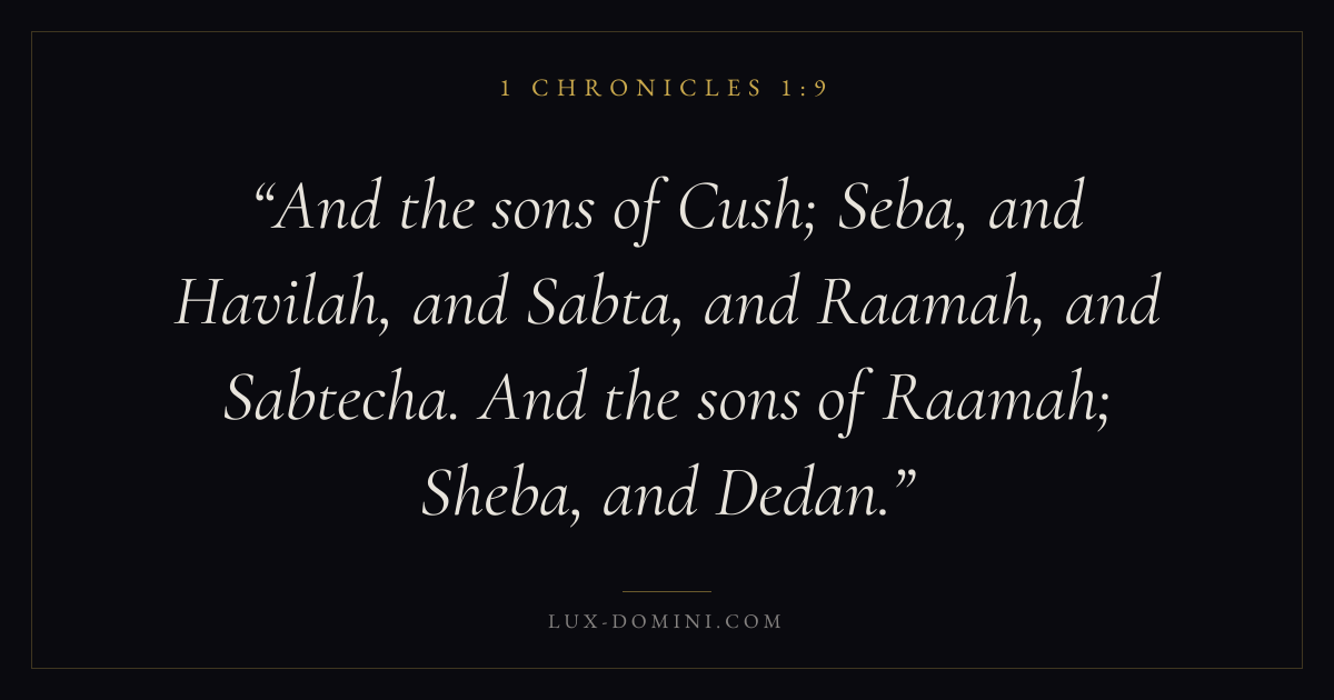 And the sons of Cush; Seba, and Havilah, and Sabta, and Raamah, and Sabtecha. And the sons of Raamah; Sheba, and Dedan.