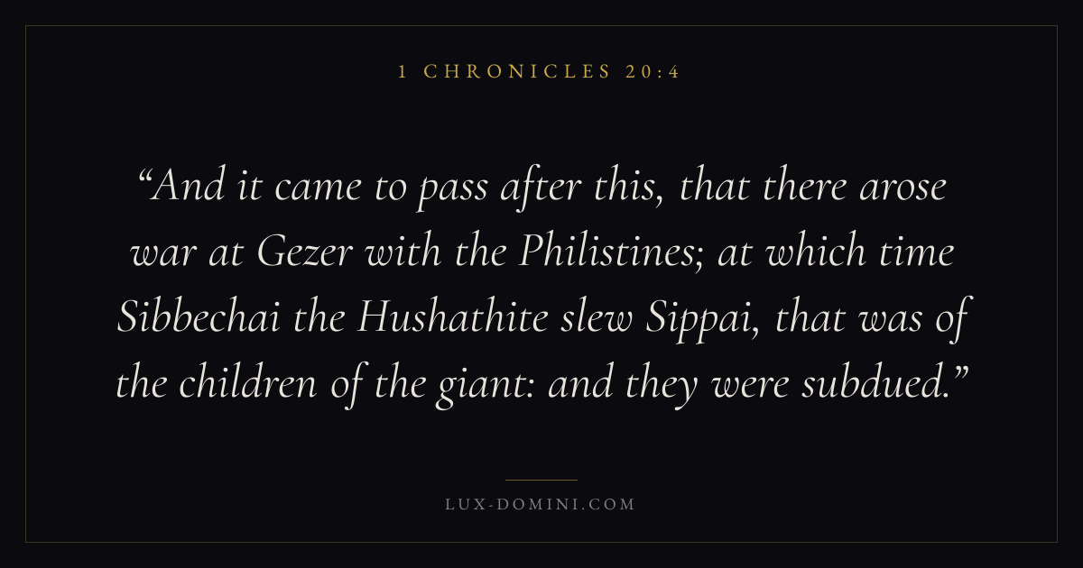 And it came to pass after this, that there arose war at Gezer with the Philistines; at which time Sibbechai the Hushathite slew Sippai, that was of the children of the giant: and they were subdued.