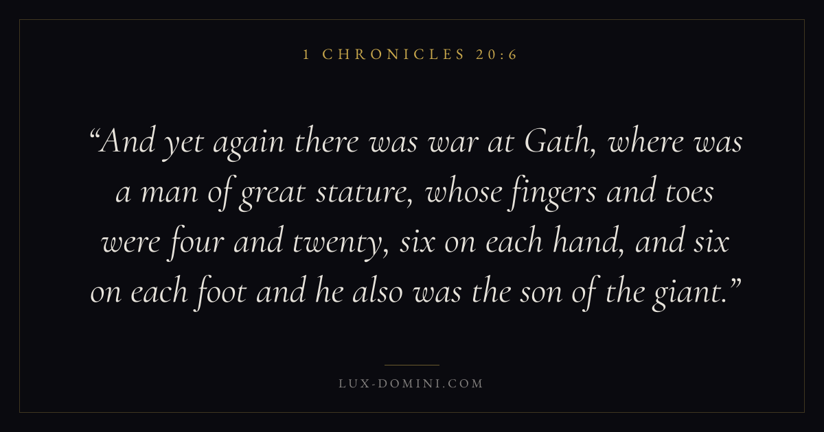 And yet again there was war at Gath, where was a man of great stature, whose fingers and toes were four and twenty, six on each hand, and six on each foot and he also was the son of the giant.