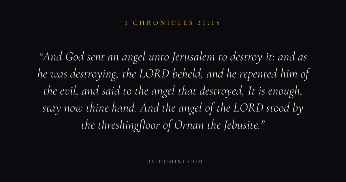 And God sent an angel unto Jerusalem to destroy it: and as he was destroying, the LORD beheld, and he repented him of the evil, and said to the angel that destroyed, It is enough, stay now thine hand. And the angel of the LORD stood by the threshingfloor of Ornan the Jebusite.