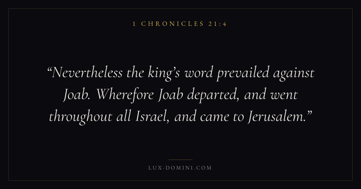 Nevertheless the king’s word prevailed against Joab. Wherefore Joab departed, and went throughout all Israel, and came to Jerusalem.