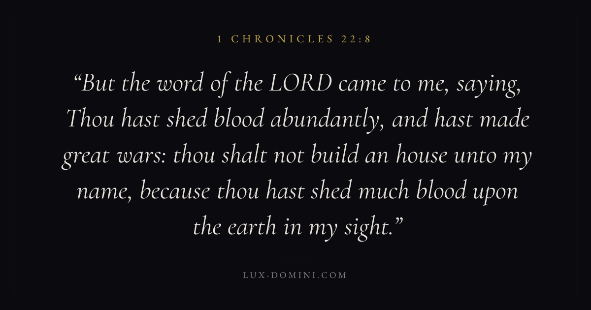 But the word of the LORD came to me, saying, Thou hast shed blood abundantly, and hast made great wars: thou shalt not build an house unto my name, because thou hast shed much blood upon the earth in my sight.