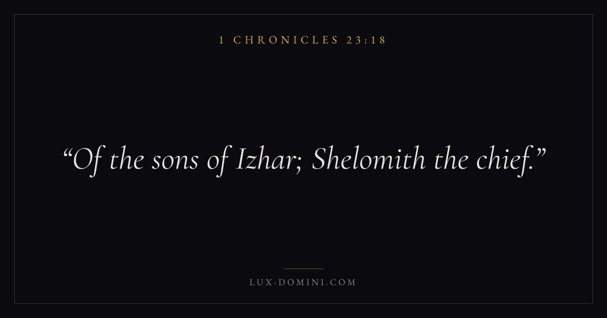 Books / 1 Chronicles / Chapter 23 / Verse 18 ← 1 Chronicles 23:17 1 Chronicles 23:18 1 Chronicles 23:19 → Of the sons of Izhar; Shelomith the chief. Download verse card Share on Twitter Share on Facebook Pin it ✦ Key themes LoveMemoryWorshipGenealogy Read with 1 Chronicles 23:191 Chronicles 23:20John 3:161 Corinthians 13:4 Related topics Bible verses about loveBible verses about worship ✦ 1 Chronicles Chapter 23 verses V. 1 V. 2 V. 3 V. 4 V. 5 V. 6 V. 7 V. 8 V. 9 V. 10 V. 11 V. 12 V. 13 V. 14 V. 15 V. 16 V. 17 V. 18 V. 19 V. 20 V. 21 V. 22 V. 23 V. 24 V. 25 V. 26 V. 27 V. 28 V. 29 V. 30 V. 31 V. 32