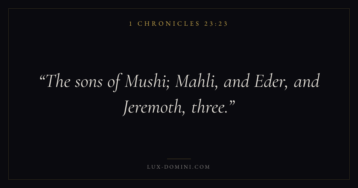 Books / 1 Chronicles / Chapter 23 / Verse 23 ← 1 Chronicles 23:22 1 Chronicles 23:23 1 Chronicles 23:24 → The sons of Mushi; Mahli, and Eder, and Jeremoth, three. Download verse card Share on Twitter Share on Facebook Pin it ✦ Key themes LoveMemoryWorshipGenealogy Read with 1 Chronicles 23:211 Chronicles 23:22John 3:161 Corinthians 13:4 Related topics Bible verses about loveBible verses about worship ✦ 1 Chronicles Chapter 23 verses V. 1 V. 2 V. 3 V. 4 V. 5 V. 6 V. 7 V. 8 V. 9 V. 10 V. 11 V. 12 V. 13 V. 14 V. 15 V. 16 V. 17 V. 18 V. 19 V. 20 V. 21 V. 22 V. 23 V. 24 V. 25 V. 26 V. 27 V. 28 V. 29 V. 30 V. 31 V. 32