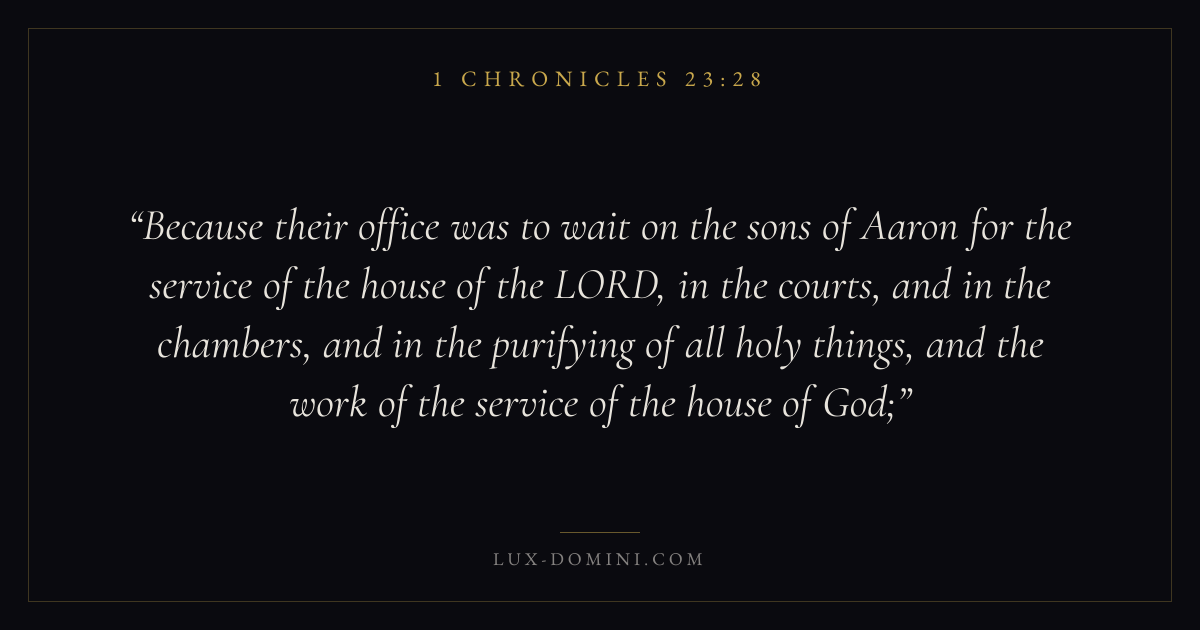 Because their office was to wait on the sons of Aaron for the service of the house of the LORD, in the courts, and in the chambers, and in the purifying of all holy things, and the work of the service of the house of God;