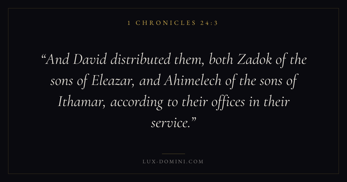 And David distributed them, both Zadok of the sons of Eleazar, and Ahimelech of the sons of Ithamar, according to their offices in their service.