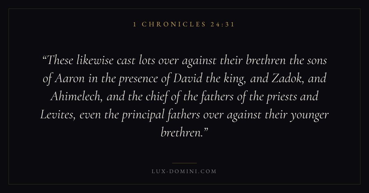 These likewise cast lots over against their brethren the sons of Aaron in the presence of David the king, and Zadok, and Ahimelech, and the chief of the fathers of the priests and Levites, even the principal fathers over against their younger brethren.