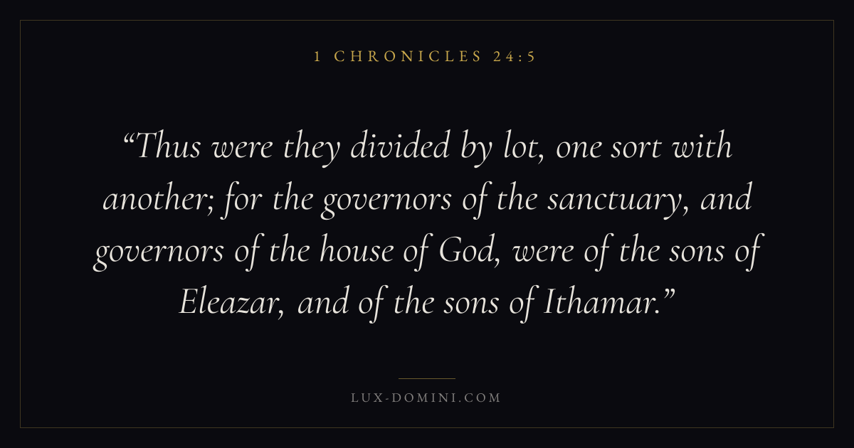 Thus were they divided by lot, one sort with another; for the governors of the sanctuary, and governors of the house of God, were of the sons of Eleazar, and of the sons of Ithamar.