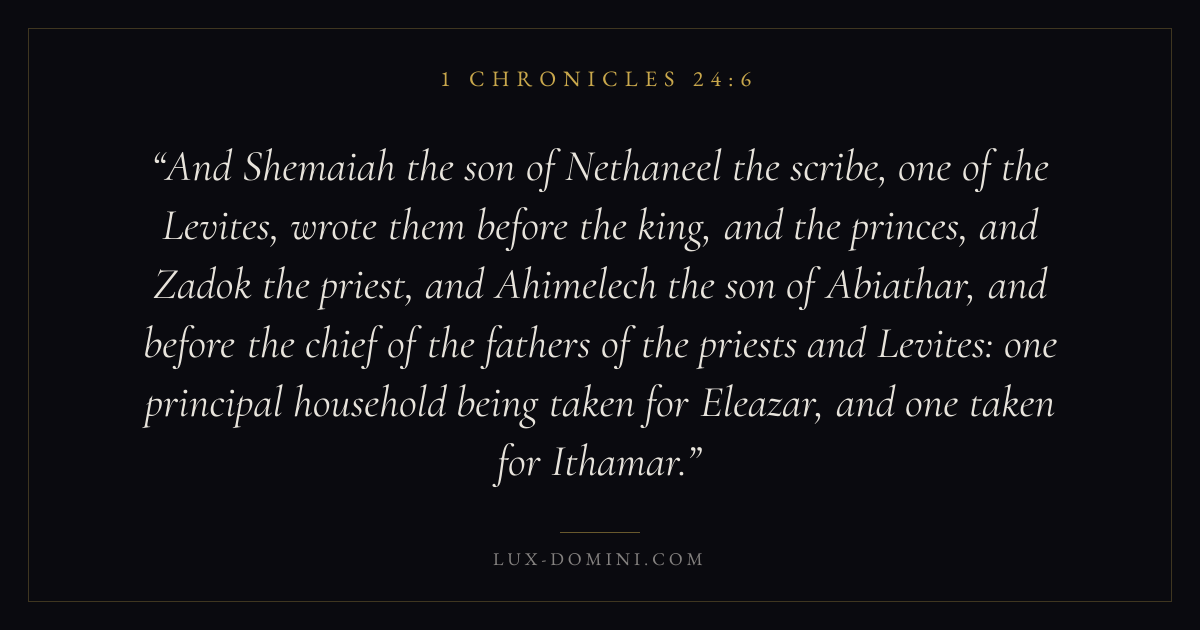 And Shemaiah the son of Nethaneel the scribe, one of the Levites, wrote them before the king, and the princes, and Zadok the priest, and Ahimelech the son of Abiathar, and before the chief of the fathers of the priests and Levites: one principal household being taken for Eleazar, and one taken for Ithamar.