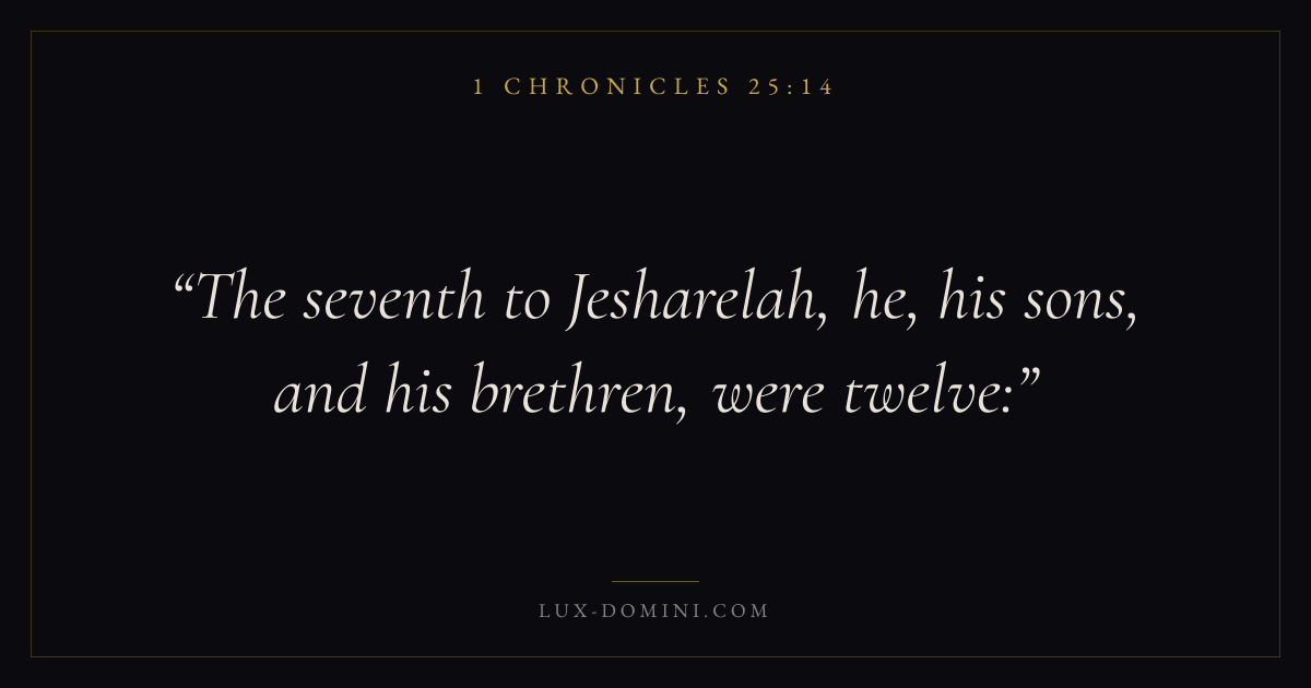 Books / 1 Chronicles / Chapter 25 / Verse 14 ← 1 Chronicles 25:13 1 Chronicles 25:14 1 Chronicles 25:15 → The seventh to Jesharelah, he, his sons, and his brethren, were twelve: Download verse card Share on Twitter Share on Facebook Pin it ✦ Key themes MemoryWorshipGenealogyDavid Read with 1 Chronicles 25:131 Chronicles 25:15 Related topics Bible verses about worship ✦ 1 Chronicles Chapter 25 verses V. 1 V. 2 V. 3 V. 4 V. 5 V. 6 V. 7 V. 8 V. 9 V. 10 V. 11 V. 12 V. 13 V. 14 V. 15 V. 16 V. 17 V. 18 V. 19 V. 20 V. 21 V. 22 V. 23 V. 24 V. 25 V. 26 V. 27 V. 28 V. 29 V. 30 V. 31