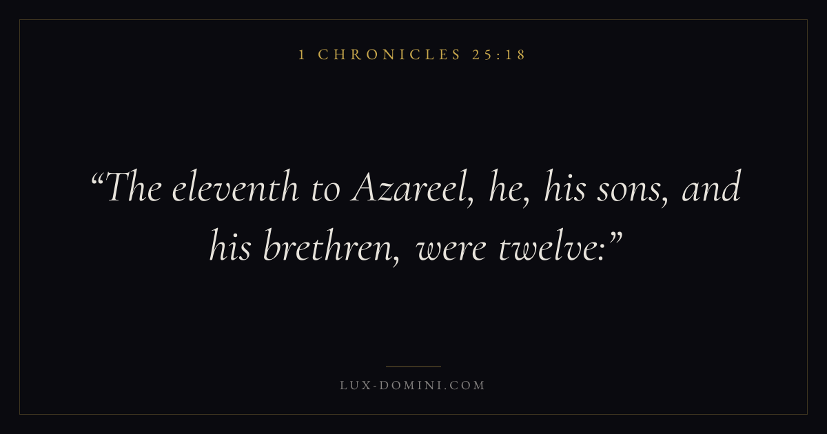 Books / 1 Chronicles / Chapter 25 / Verse 18 ← 1 Chronicles 25:17 1 Chronicles 25:18 1 Chronicles 25:19 → The eleventh to Azareel, he, his sons, and his brethren, were twelve: Download verse card Share on Twitter Share on Facebook Pin it ✦ Key themes MemoryWorshipGenealogyDavid Read with 1 Chronicles 25:191 Chronicles 25:20 Related topics Bible verses about worship ✦ 1 Chronicles Chapter 25 verses V. 1 V. 2 V. 3 V. 4 V. 5 V. 6 V. 7 V. 8 V. 9 V. 10 V. 11 V. 12 V. 13 V. 14 V. 15 V. 16 V. 17 V. 18 V. 19 V. 20 V. 21 V. 22 V. 23 V. 24 V. 25 V. 26 V. 27 V. 28 V. 29 V. 30 V. 31