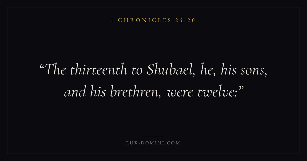 Books / 1 Chronicles / Chapter 25 / Verse 20 ← 1 Chronicles 25:19 1 Chronicles 25:20 1 Chronicles 25:21 → The thirteenth to Shubael, he, his sons, and his brethren, were twelve: Download verse card Share on Twitter Share on Facebook Pin it ✦ Key themes MemoryWorshipGenealogyDavid Read with 1 Chronicles 25:181 Chronicles 25:19 Related topics Bible verses about worship ✦ 1 Chronicles Chapter 25 verses V. 1 V. 2 V. 3 V. 4 V. 5 V. 6 V. 7 V. 8 V. 9 V. 10 V. 11 V. 12 V. 13 V. 14 V. 15 V. 16 V. 17 V. 18 V. 19 V. 20 V. 21 V. 22 V. 23 V. 24 V. 25 V. 26 V. 27 V. 28 V. 29 V. 30 V. 31