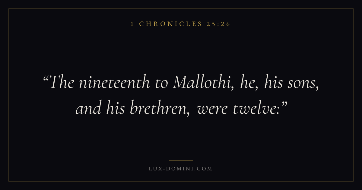 Books / 1 Chronicles / Chapter 25 / Verse 26 ← 1 Chronicles 25:25 1 Chronicles 25:26 1 Chronicles 25:27 → The nineteenth to Mallothi, he, his sons, and his brethren, were twelve: Download verse card Share on Twitter Share on Facebook Pin it ✦ Key themes MemoryWorshipGenealogyDavid Read with 1 Chronicles 25:231 Chronicles 25:24 Related topics Bible verses about worship ✦ 1 Chronicles Chapter 25 verses V. 1 V. 2 V. 3 V. 4 V. 5 V. 6 V. 7 V. 8 V. 9 V. 10 V. 11 V. 12 V. 13 V. 14 V. 15 V. 16 V. 17 V. 18 V. 19 V. 20 V. 21 V. 22 V. 23 V. 24 V. 25 V. 26 V. 27 V. 28 V. 29 V. 30 V. 31
