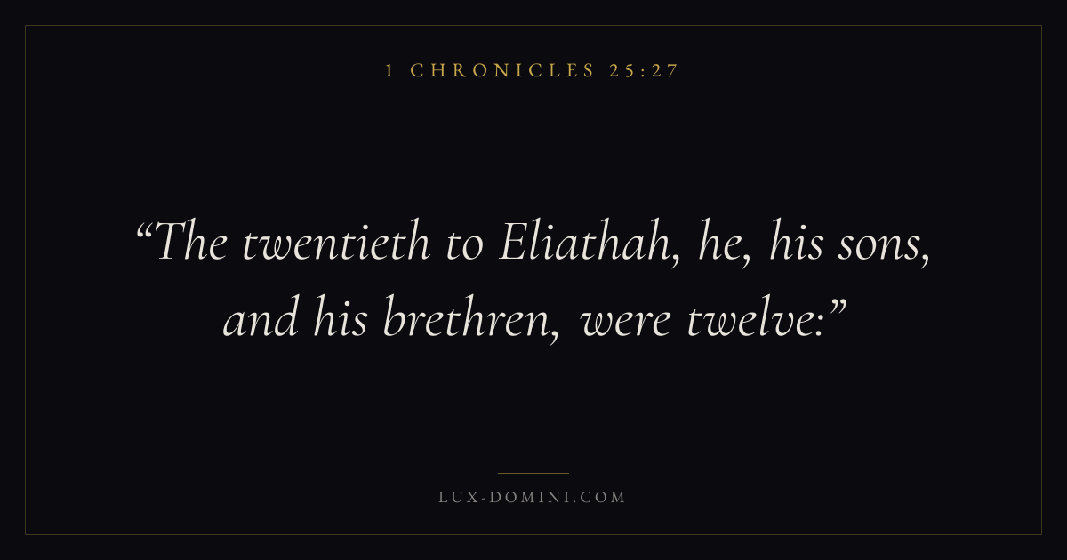 Books / 1 Chronicles / Chapter 25 / Verse 27 ← 1 Chronicles 25:26 1 Chronicles 25:27 1 Chronicles 25:28 → The twentieth to Eliathah, he, his sons, and his brethren, were twelve: Download verse card Share on Twitter Share on Facebook Pin it ✦ Key themes MemoryWorshipGenealogyDavid Read with 1 Chronicles 25:231 Chronicles 25:24 Related topics Bible verses about worship ✦ 1 Chronicles Chapter 25 verses V. 1 V. 2 V. 3 V. 4 V. 5 V. 6 V. 7 V. 8 V. 9 V. 10 V. 11 V. 12 V. 13 V. 14 V. 15 V. 16 V. 17 V. 18 V. 19 V. 20 V. 21 V. 22 V. 23 V. 24 V. 25 V. 26 V. 27 V. 28 V. 29 V. 30 V. 31