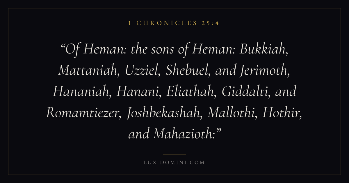 Of Heman: the sons of Heman: Bukkiah, Mattaniah, Uzziel, Shebuel, and Jerimoth, Hananiah, Hanani, Eliathah, Giddalti, and Romamtiezer, Joshbekashah, Mallothi, Hothir, and Mahazioth: