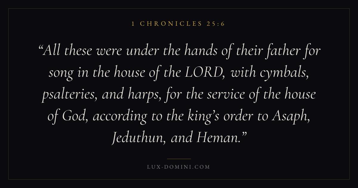 All these were under the hands of their father for song in the house of the LORD, with cymbals, psalteries, and harps, for the service of the house of God, according to the king’s order to Asaph, Jeduthun, and Heman.
