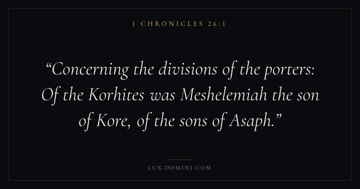Concerning the divisions of the porters: Of the Korhites was Meshelemiah the son of Kore, of the sons of Asaph.