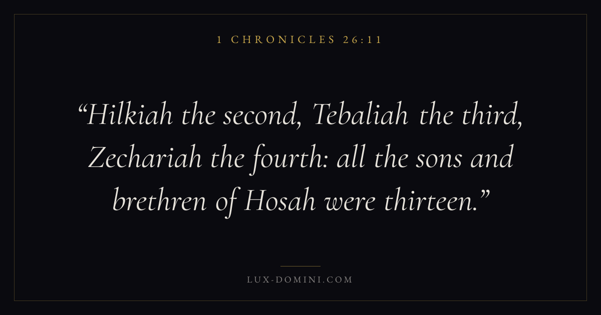 Hilkiah the second, Tebaliah the third, Zechariah the fourth: all the sons and brethren of Hosah were thirteen.
