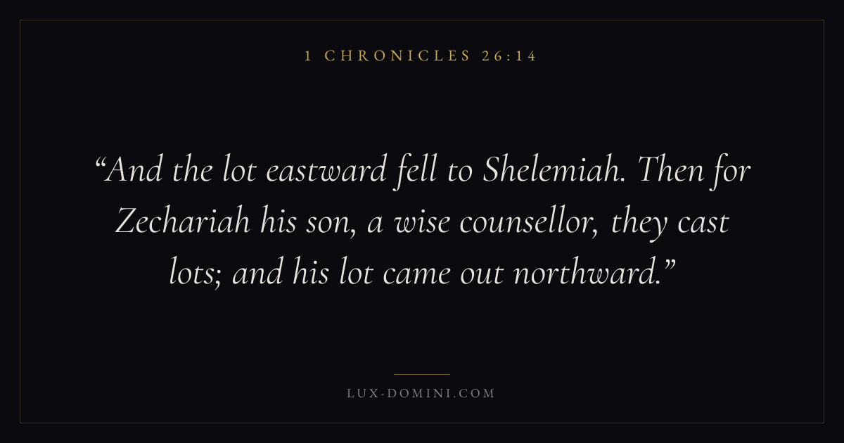 And the lot eastward fell to Shelemiah. Then for Zechariah his son, a wise counsellor, they cast lots; and his lot came out northward.