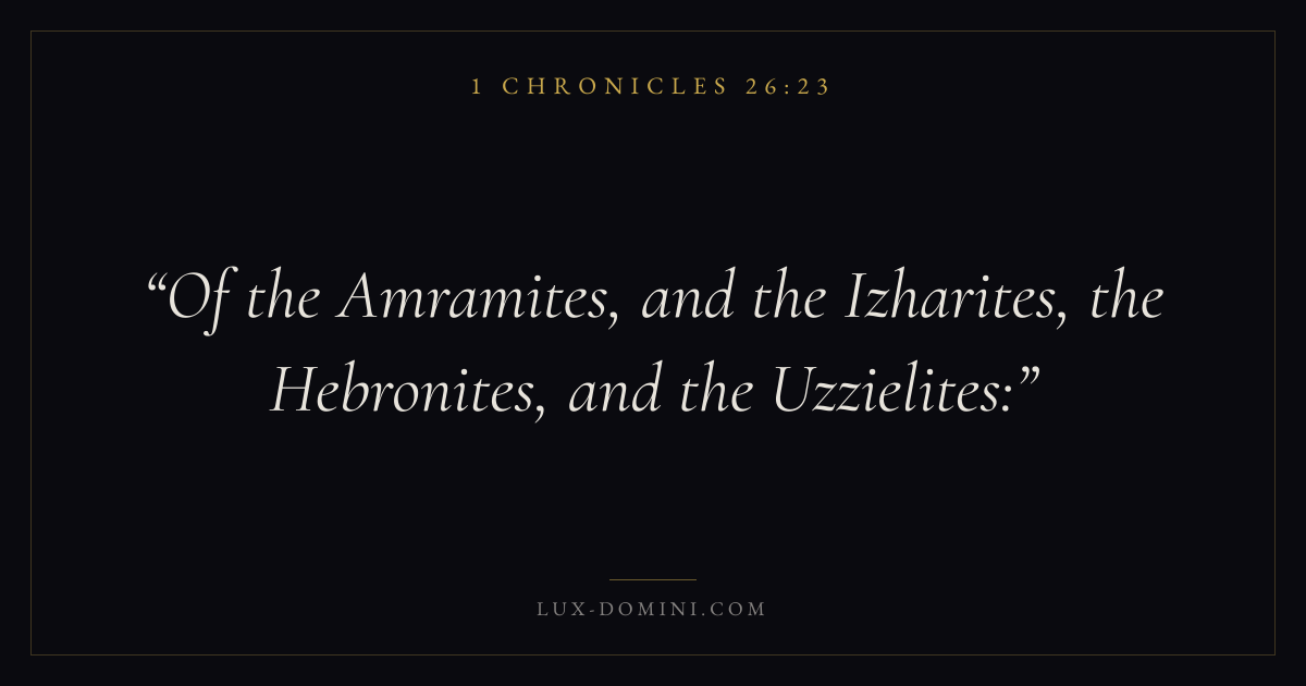 Books / 1 Chronicles / Chapter 26 / Verse 23 ← 1 Chronicles 26:22 1 Chronicles 26:23 1 Chronicles 26:24 → Of the Amramites, and the Izharites, the Hebronites, and the Uzzielites: Download verse card Share on Twitter Share on Facebook Pin it ✦ Key themes MemoryWorshipGenealogyDavid Read with 1 Chronicles 26:241 Chronicles 26:25 Related topics Bible verses about worship ✦ 1 Chronicles Chapter 26 verses V. 1 V. 2 V. 3 V. 4 V. 5 V. 6 V. 7 V. 8 V. 9 V. 10 V. 11 V. 12 V. 13 V. 14 V. 15 V. 16 V. 17 V. 18 V. 19 V. 20 V. 21 V. 22 V. 23 V. 24 V. 25 V. 26 V. 27 V. 28 V. 29 V. 30 V. 31 V. 32