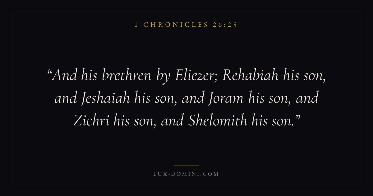And his brethren by Eliezer; Rehabiah his son, and Jeshaiah his son, and Joram his son, and Zichri his son, and Shelomith his son.