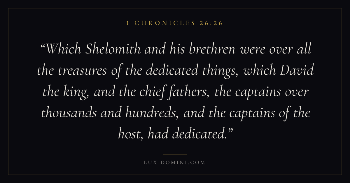 Which Shelomith and his brethren were over all the treasures of the dedicated things, which David the king, and the chief fathers, the captains over thousands and hundreds, and the captains of the host, had dedicated.